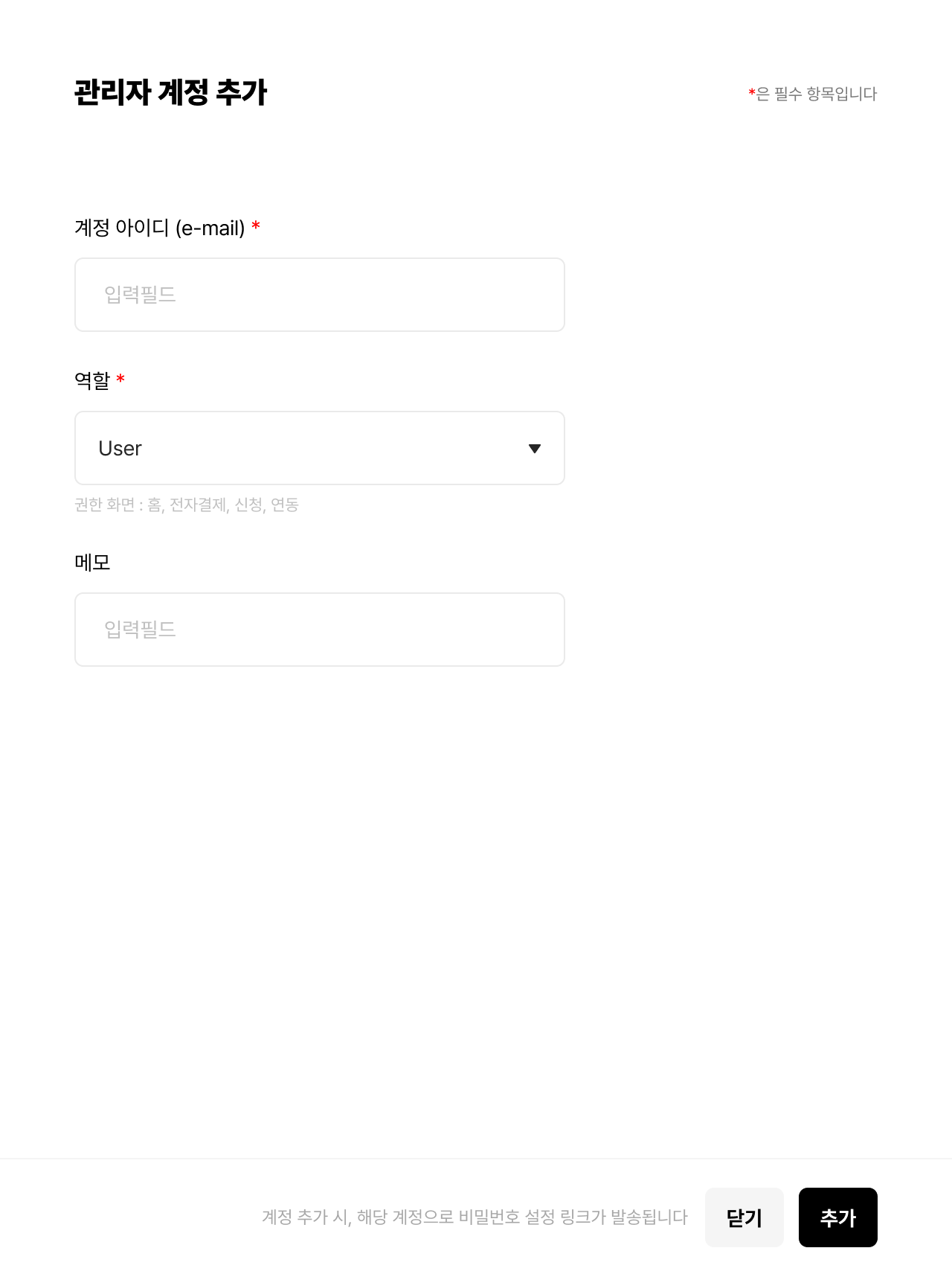 • 관리자 계정 (Admin) : Owner가 생성할 수 있으며, 모든 기능을 사용할 수 있습니다.