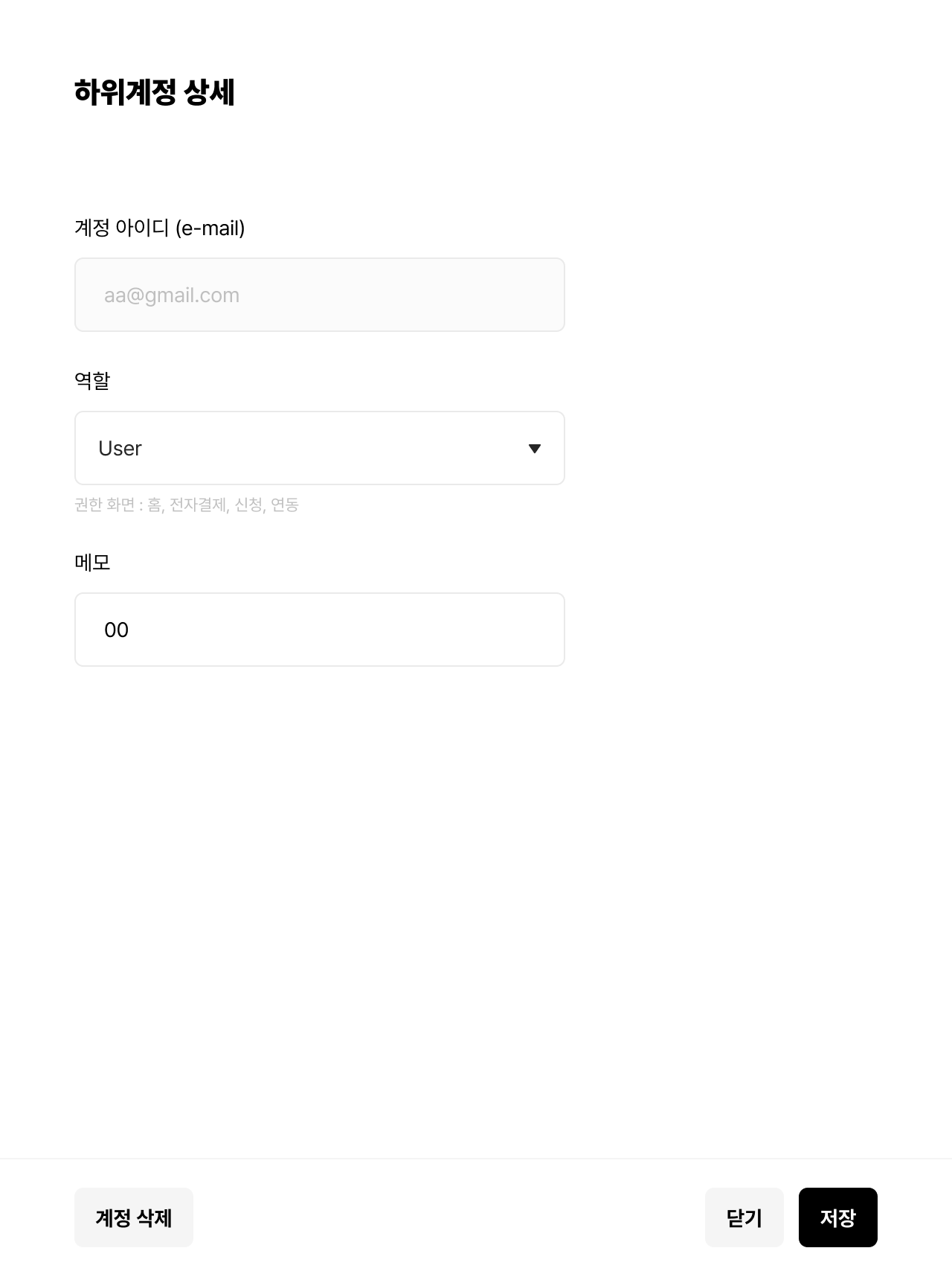 • 고객사 관리자 계정은 하위상점을 추가, 수정 할 수 있으며 해당 하위상점의 소속된 계정을 생성, 수정, 삭제 하실 수 있으십니다.