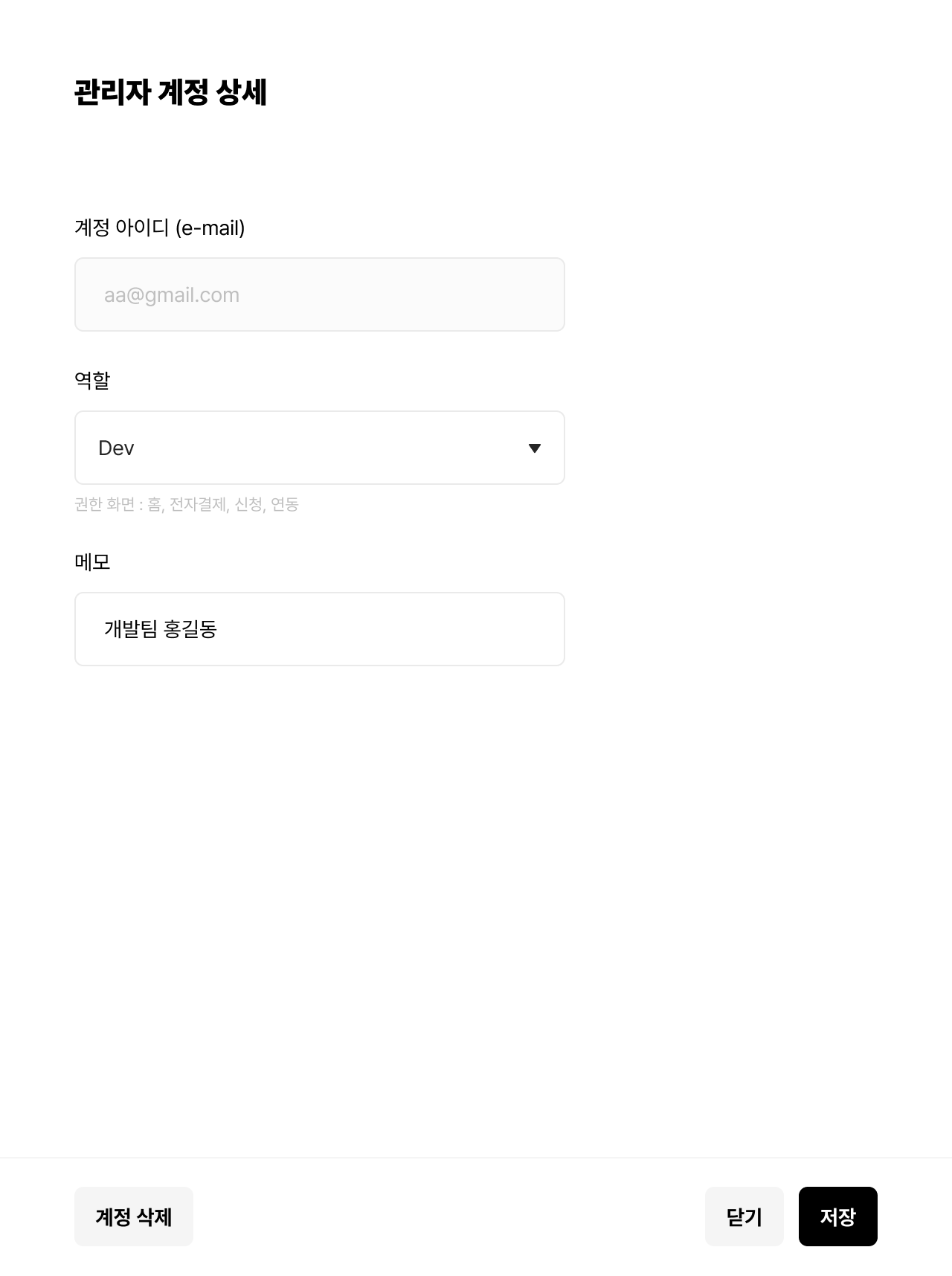 • 결제 연동 기능만 사용이 가능하며, 상점 계정 관리는 조회만 가능합니다.