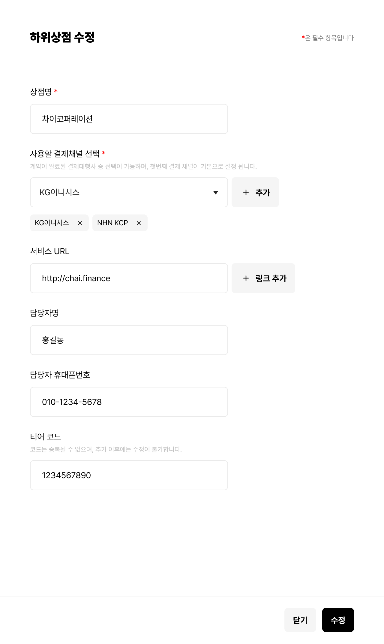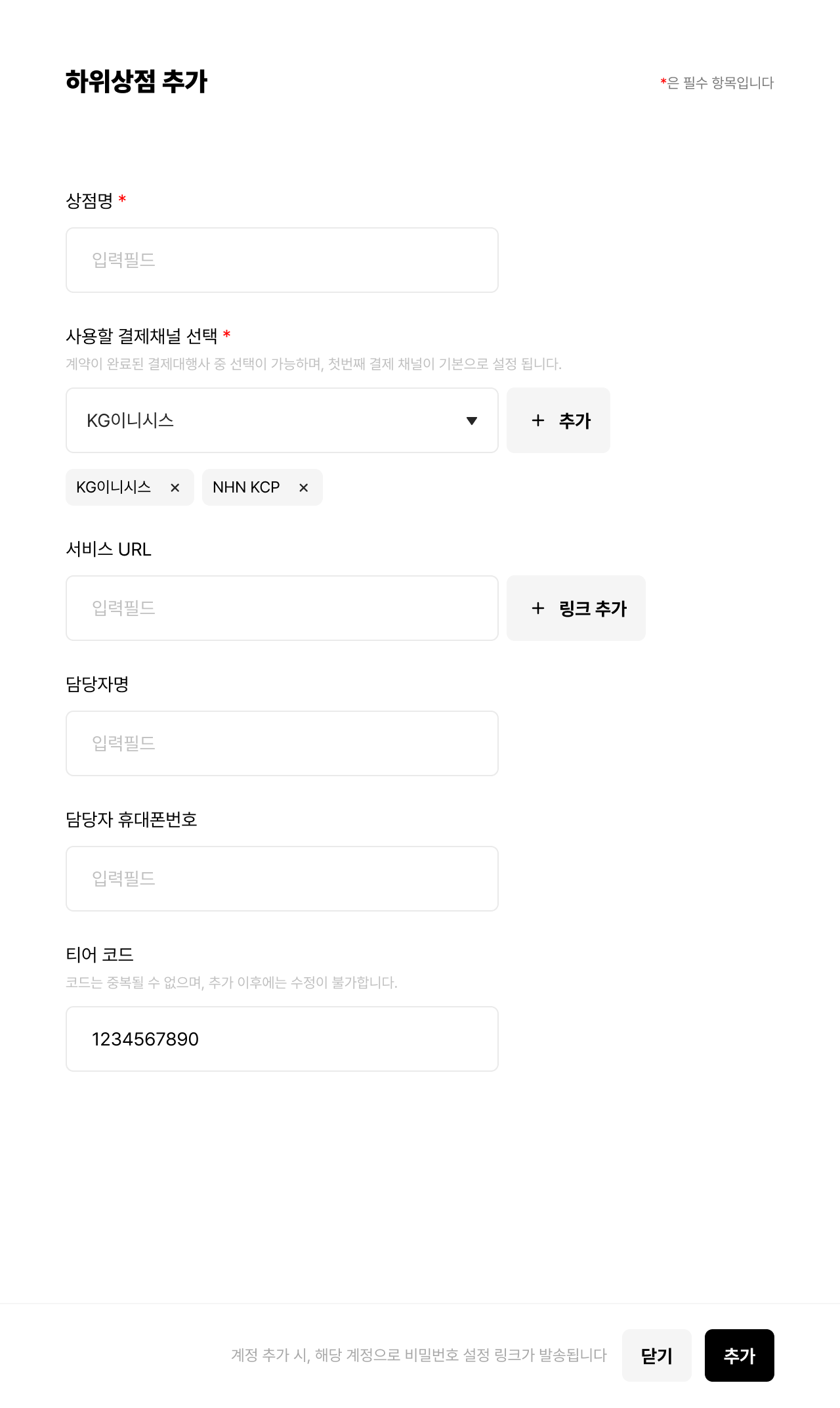 • 상점 명 입력, 사용할 결제채널 선택, 서비스 url 입력, 담당자 정보 입력, 티어코드 입력 후 하위상점을 추가하실 수 있습니다