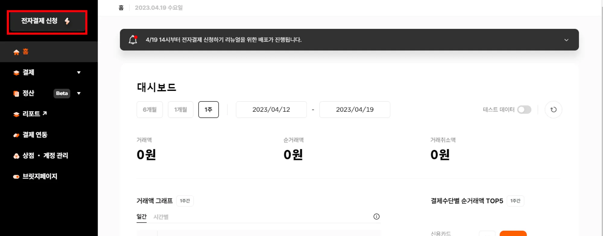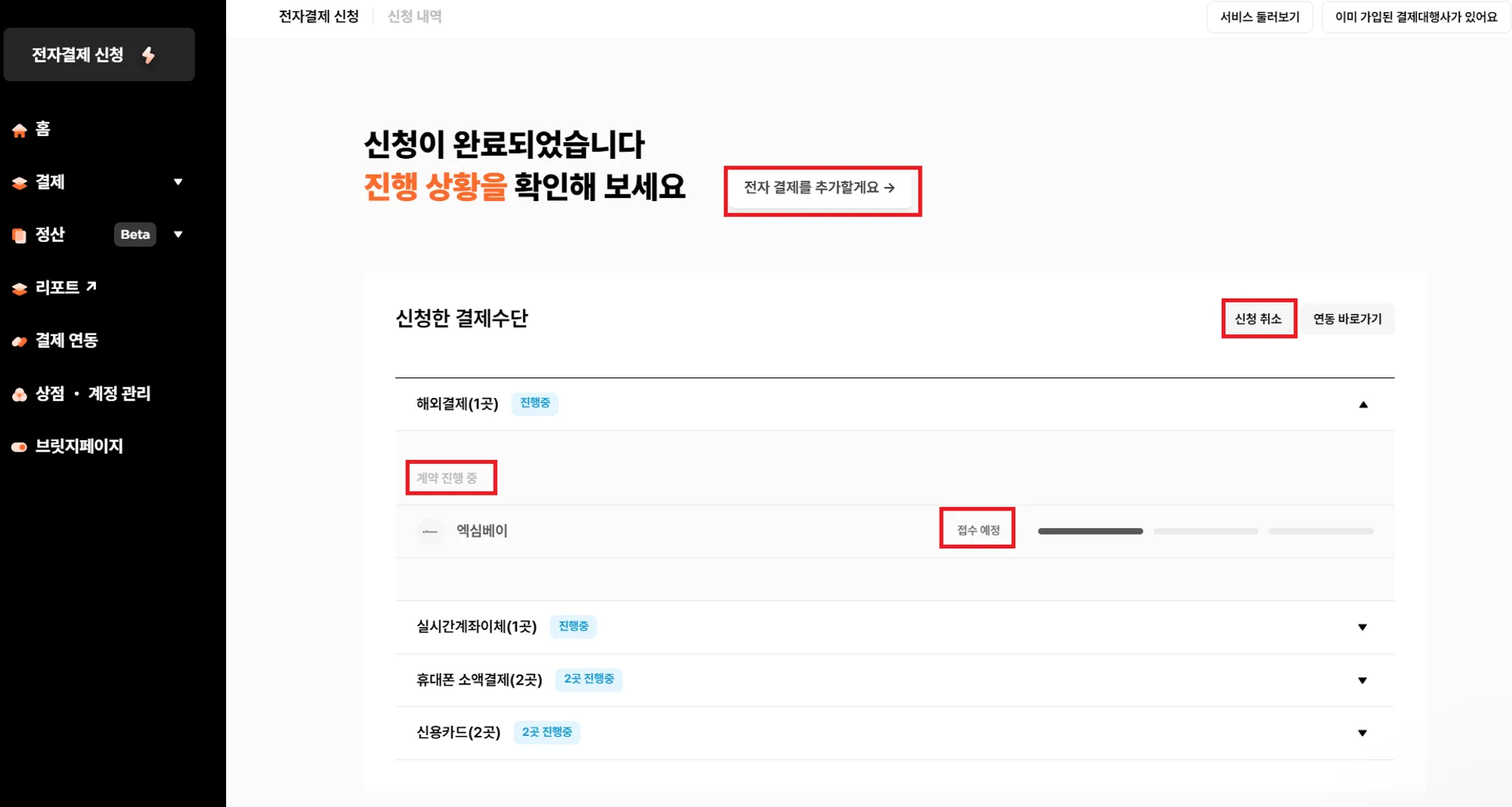 • 신청한 결제대행사와 결제수단을 확인할 수 있습니다.