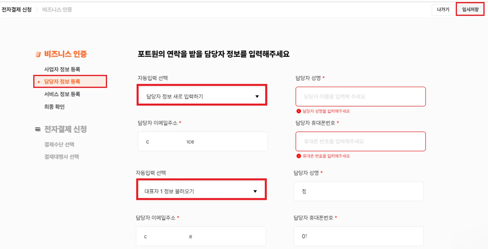 • 전자결제 신청 완료 후 결제대행사 및 포트원의 안내를 받을 담당자 정보를 등록해 주세요.