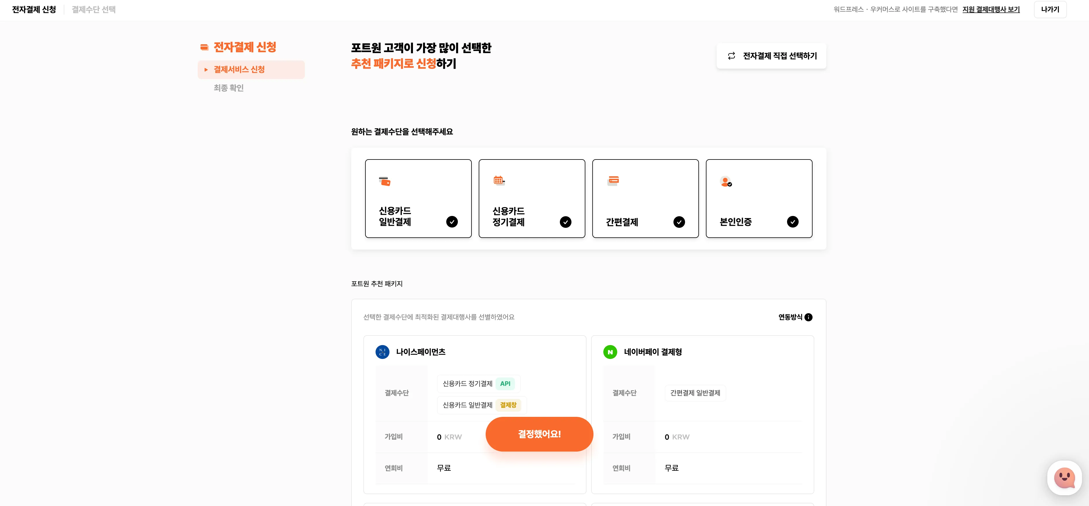 • 선호하는 결제수단을 선택하면, 그에 따라 포트원 추천 패키지가 노출됩니다. 결제대행사 선택이 어려우신 경우 추천패키지로 쉽고 간편하게 신청이 가능합니다.