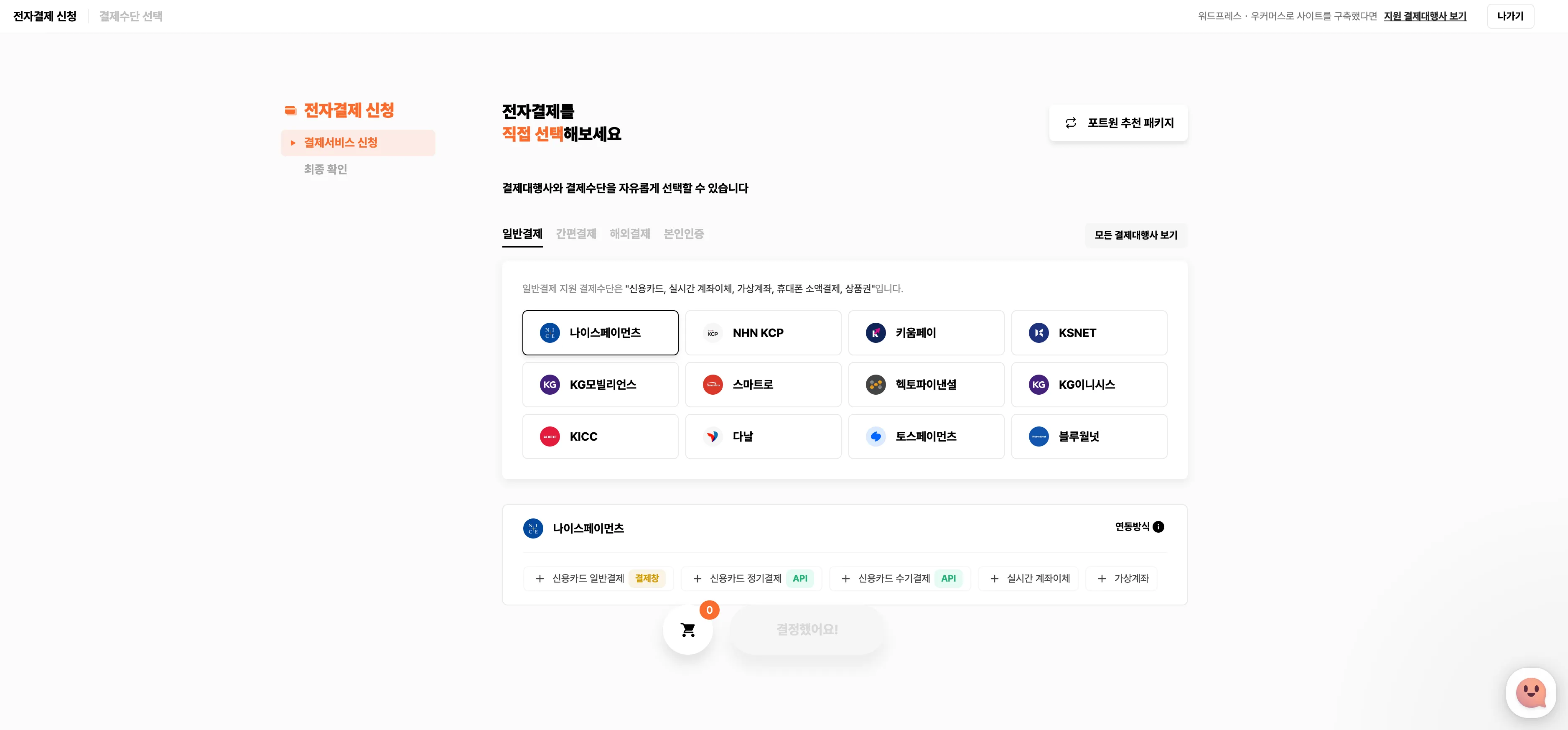 • 우측 상단 전자결제 직접 선택하기 버튼을 클릭하시면 원하시는 결제대행사(PG사)를 직접 선택하여 신청하실 수 있습니다.