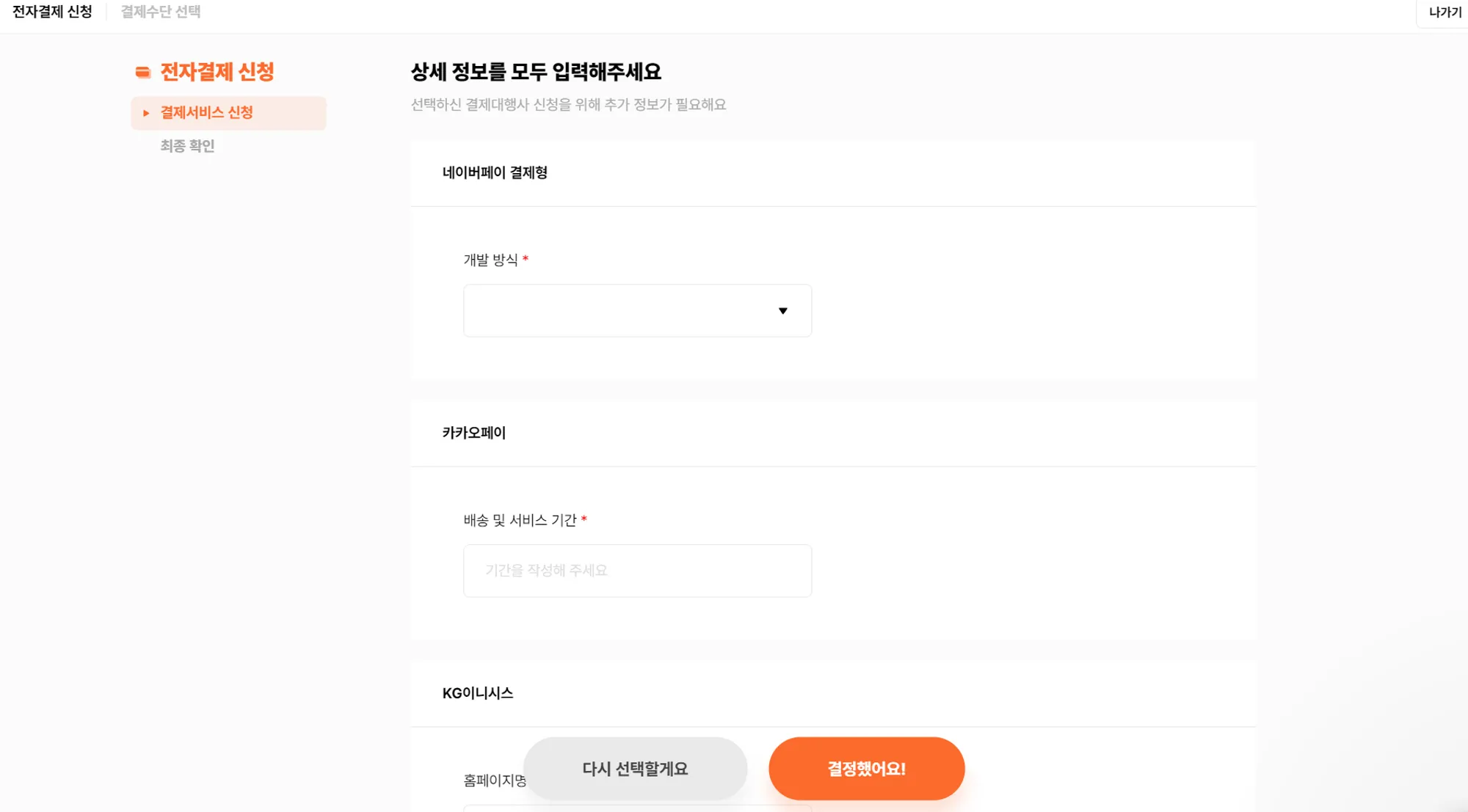 • 특정 결제대행사의 경우, 계약에 필요한 상세 정보 입력이 필요합니다. 내용을 확인하고 꼼꼼히 상세 정보를 입력해주세요.