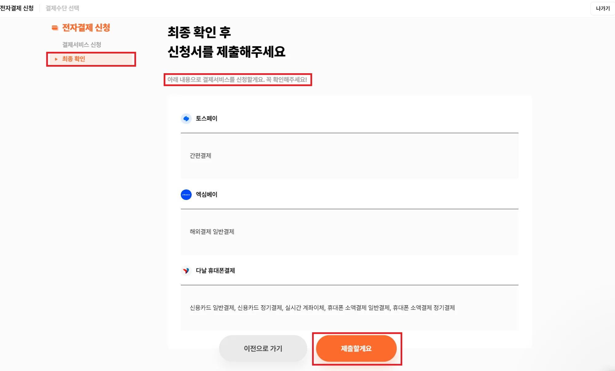 • 사업자 등록증이 없는 경우 전자결제 신청이 불가능합니다. 사업자 등록 이후 서비스를 신청해 주세요.