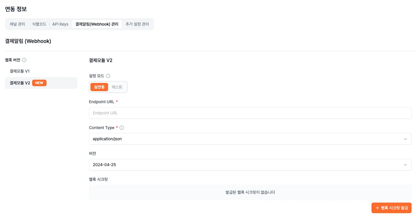 • [설정 모드] 항목에서 [실연동] 또는 [테스트]를 선택합니다. (연동 환경에 따라 웹훅 시크릿을 각각 발급할 수 있습니다.)