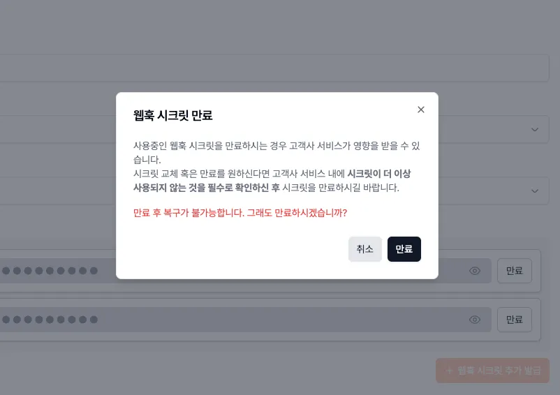 • 우측 하단의 [웹훅 시크릿 발급] 버튼을 클릭합니다.