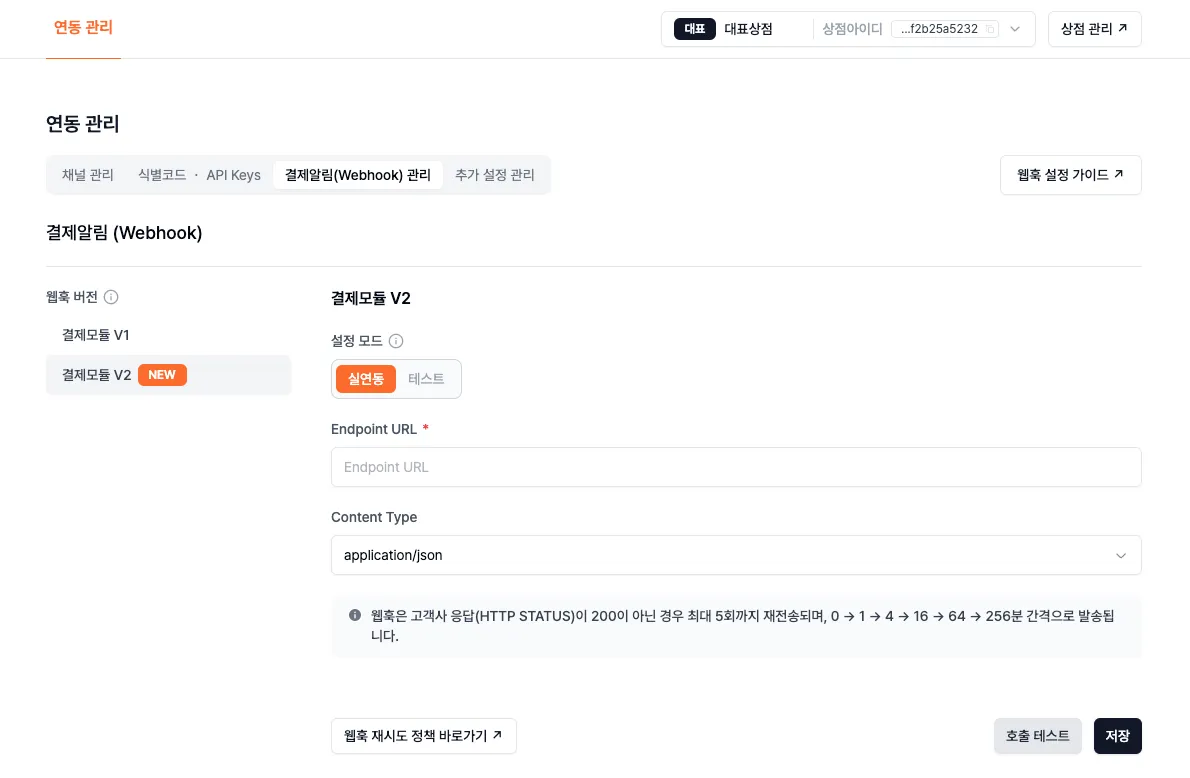 • [웹훅 버전] 항목에서 [결제모듈 V2] 를 선택합니다.