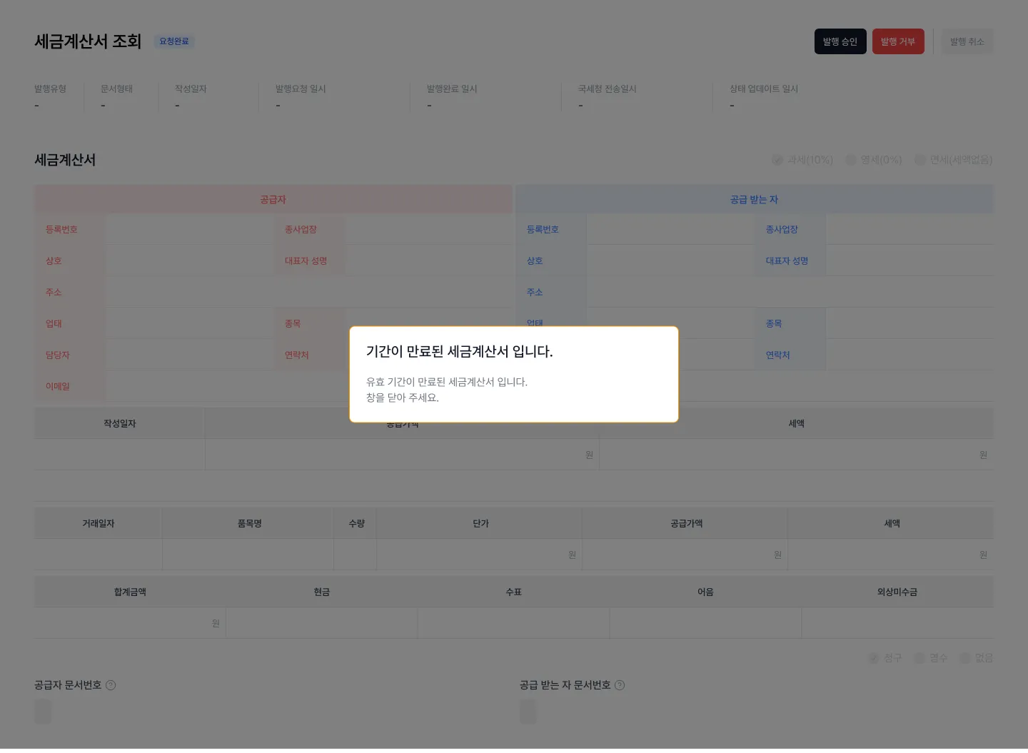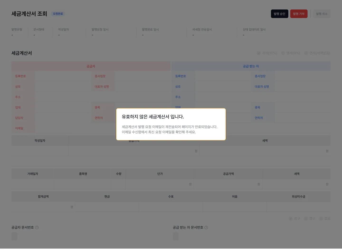 - 토큰이 만료(이메일 발송일로부터 2달 경과)된 세금계산서에 대하여 에러 메시지를 노출합니다.