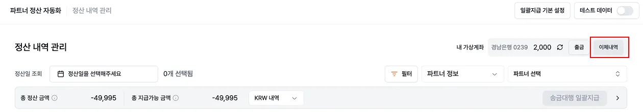 Step 1. ์ง„์ž… ๊ฒฝ๋กœ: ์ •์‚ฐ ๋‚ด์—ญ ๊ด€๋ฆฌ > ์ด์ฒด๋‚ด์—ญ