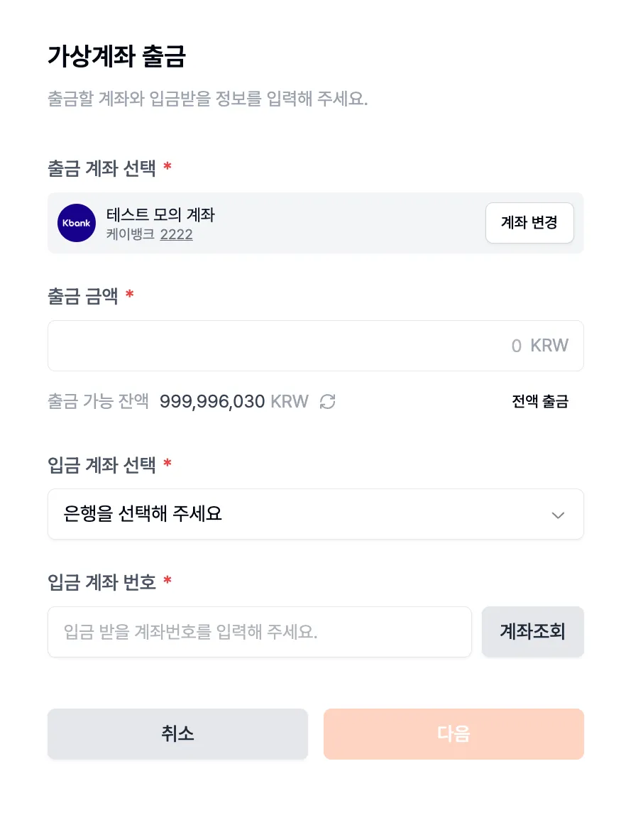 발급된 여러 가상 계좌에서 각각 출금 기능을 이용할 수 있습니다. 가상 계좌에서 출금 시, 여러 개의 계좌 중 원하는 계좌를 선택하여 출금을 진행할 수 있습니다. 송금대행 일괄지급 실행 시에는 출금 계좌를 선택해야 하며, 선택된 계좌의 잔액이 충분한 경우에만 송금이 실행됩니다.